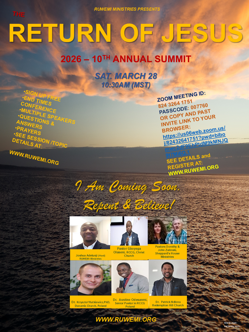 THE RETURN OF JESUS 2026 – 10th Annual Summit – Saturday March 28, 2026, 10:30AM (MST). Check your time zone for this event. Register below. Join the summit online on March 28: Zoom. View and share poster. View/share promo video. View Program of Events (to be uploaded). DONATE . Zoom Summit Meeting ID: 8243264 1751. Passcode: 007760.