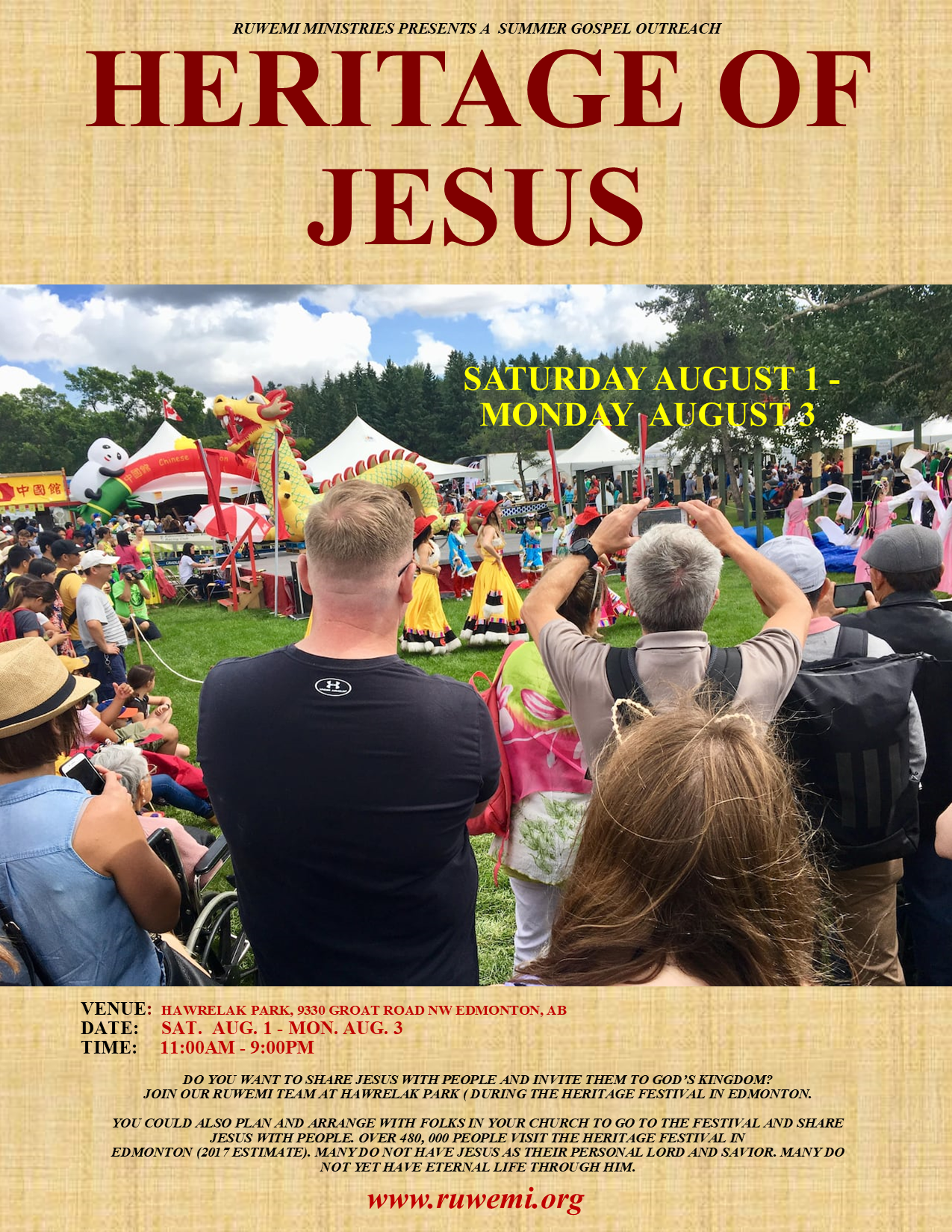 Once again, our team will be going to the annual Edmonton Heritage Festival from August 1 to 3, for what we describe as the Heritage of Jesus gospel outreach. We want to encourage you to either join us or separately mobilize people from your church to also go and share Jesus with people at the festival. You can also get your church invitation flyers to invite them over to your church. With mounting restrictions and opposition consistent with the rapidly changing global landscape, this may be our last chance to reach people around us with the gospel. The big elephant here is the 480,000 people that attend the three-day festival.